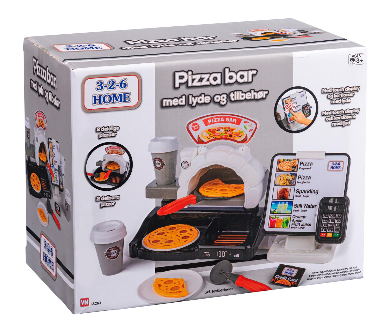 Pizzabar med lyde og tilbehør. Med touchskærm og kortlæser med lyde, kreditkort, 2 delelige pizzaer med tallerkener, pizzahjul og -spade og 2 drikkekopper med låg. Inkl. 2 stk. AAA-batterier.