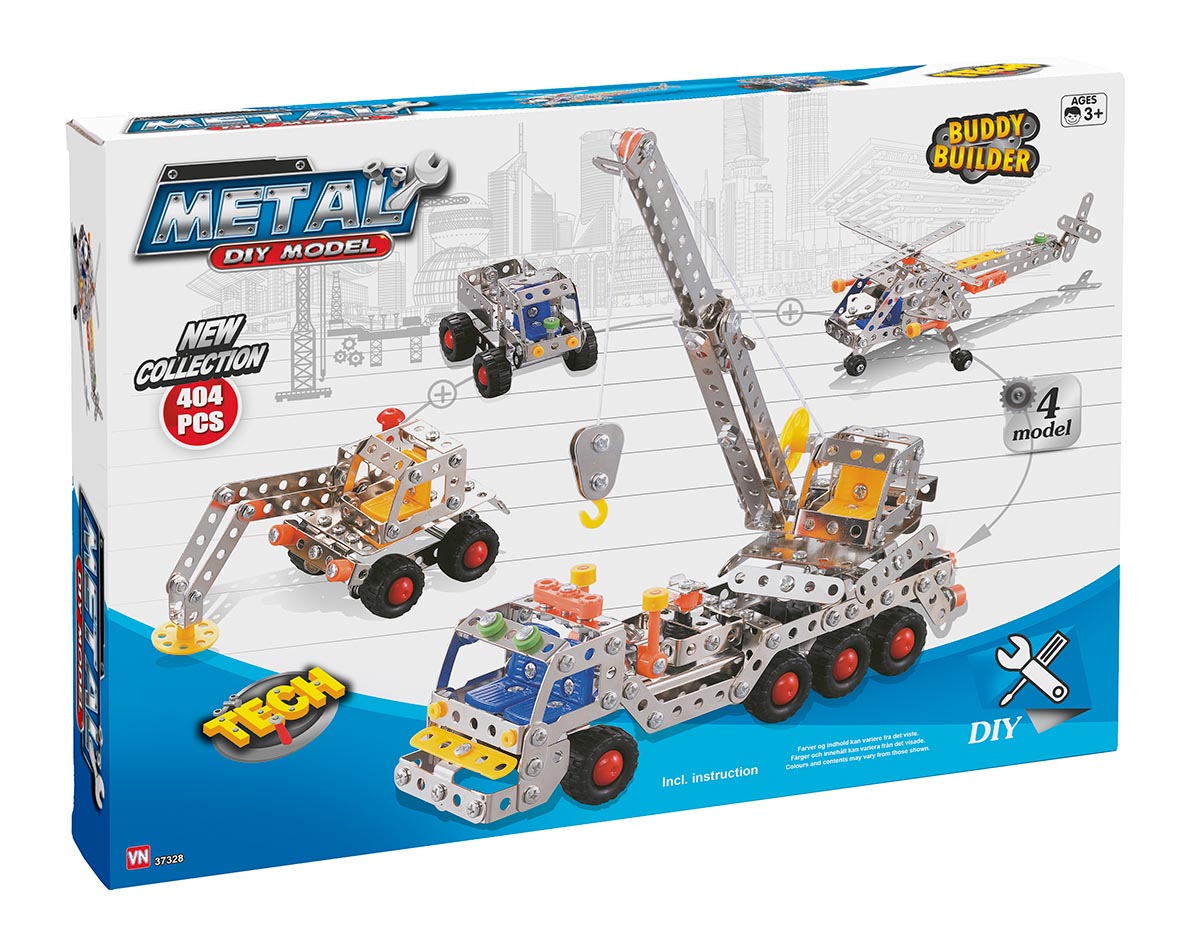 4-i-1 byggesæt i metal med 404 dele. Byg 3 køretøjer og en helikopter.