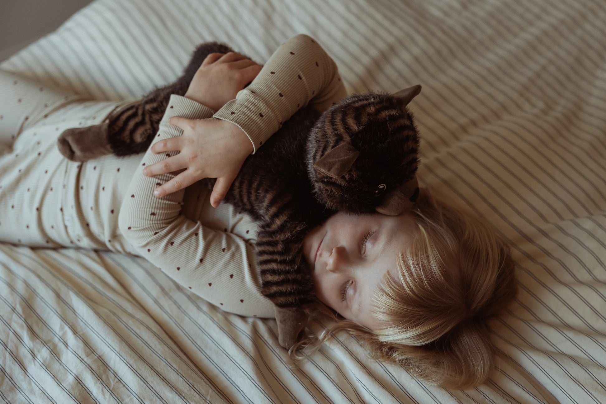 Med sine slående grå striber mod en fløjlsblød sort pels og naturtro, detaljerede sorte øjne er denne vægtede kat designet til at bringe komfort og ro til børn. Uanset om den hviler blidt på deres skød, bryst eller mave, skaber denne hyggelige katteven et beroligende og roligt miljø til afslapningsøjeblikke.