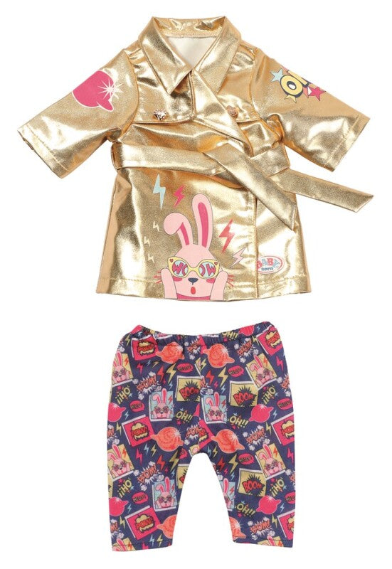 Selv om vi ikke vil betegne BABY born som Golden Girl allerede ved de 30, så passer det i hvert fald, når hun har dette outfit på. Til hendes fødselsdag præsenterer den lille trendsetter sig i en guldfarvet trench coat. Sammen med den bærer hun farverige bukser med et kosmisk-komisk print. BABY born tilbehør og tøj af høj kvalitet, som er nemt at tage af og på. Giver mulighed for endnu mere afvekslende og langvarig, sjov leg. Fra 3 år. Inkluderer: - BABY born Fødselsdag sæt med trench coat og bukser 43 cm - inkl. bøjle
