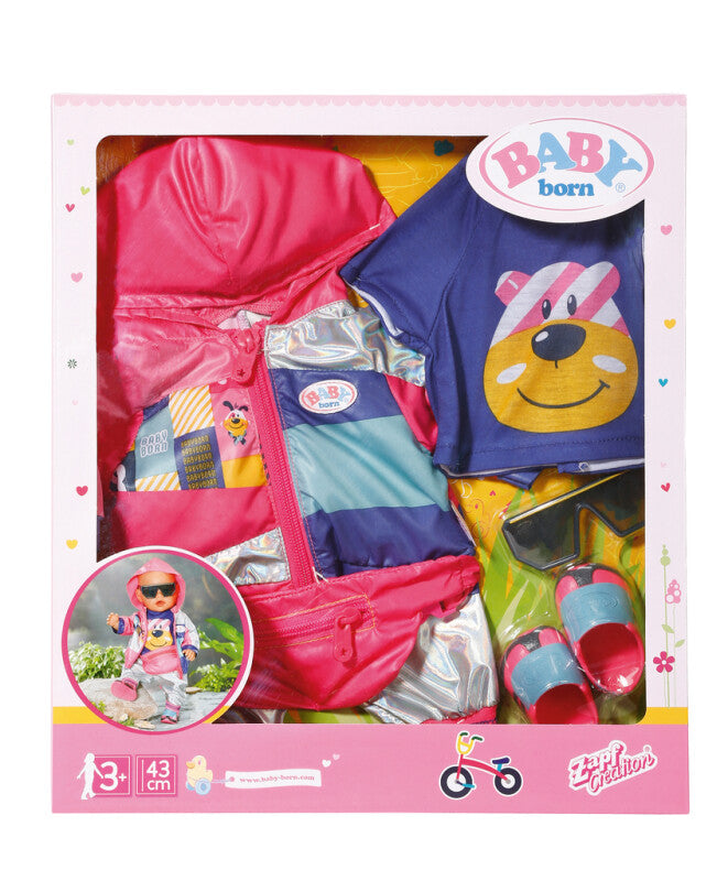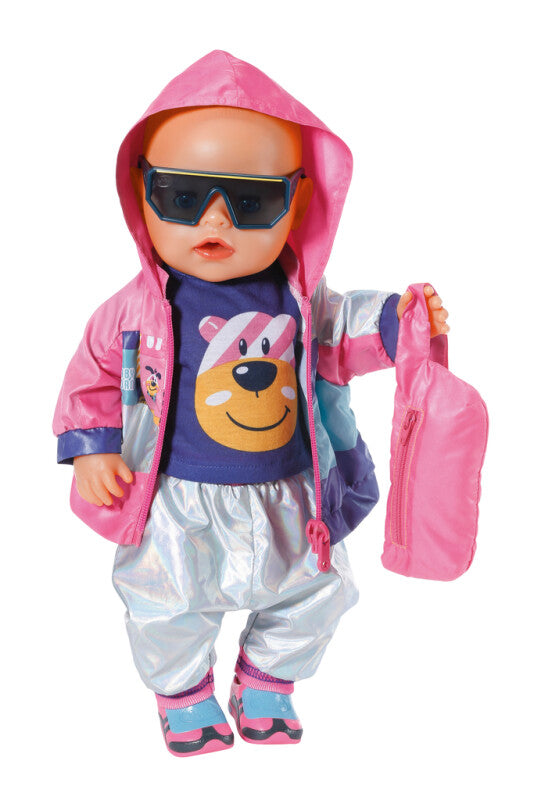 "Tuuut"! Sådan lyder starthornet for Tour de BABY born. Den lille ræser har et specielt sejt sæt til at cykle i. Hendes hættejakke har trendy geometriske mønstre, og mønstret gentager sig på solbrillerne. Jakken passer perfekt til den mørke bluse, som har et billede af bjørnen Bruno. Hun har selvfølgelig matchende sportssko på og et par sølvfarvede bukser, som skinner som en medalje i solen. Konkurrencepapirerne og en energigrød til den lille sult opbevarer hun i den pinke bæltetaske. BABY born tøj af høj kvalitet, som er nemt at tage af og på - giver mulighed for endnu mere afvekslende og langvarig, sjov leg. Fra 3 år. Inkluderer: - BABY born Luksus cykelsæt 43 cm med jakke, bluse, bukser, sko, bæltetaske og solbriller