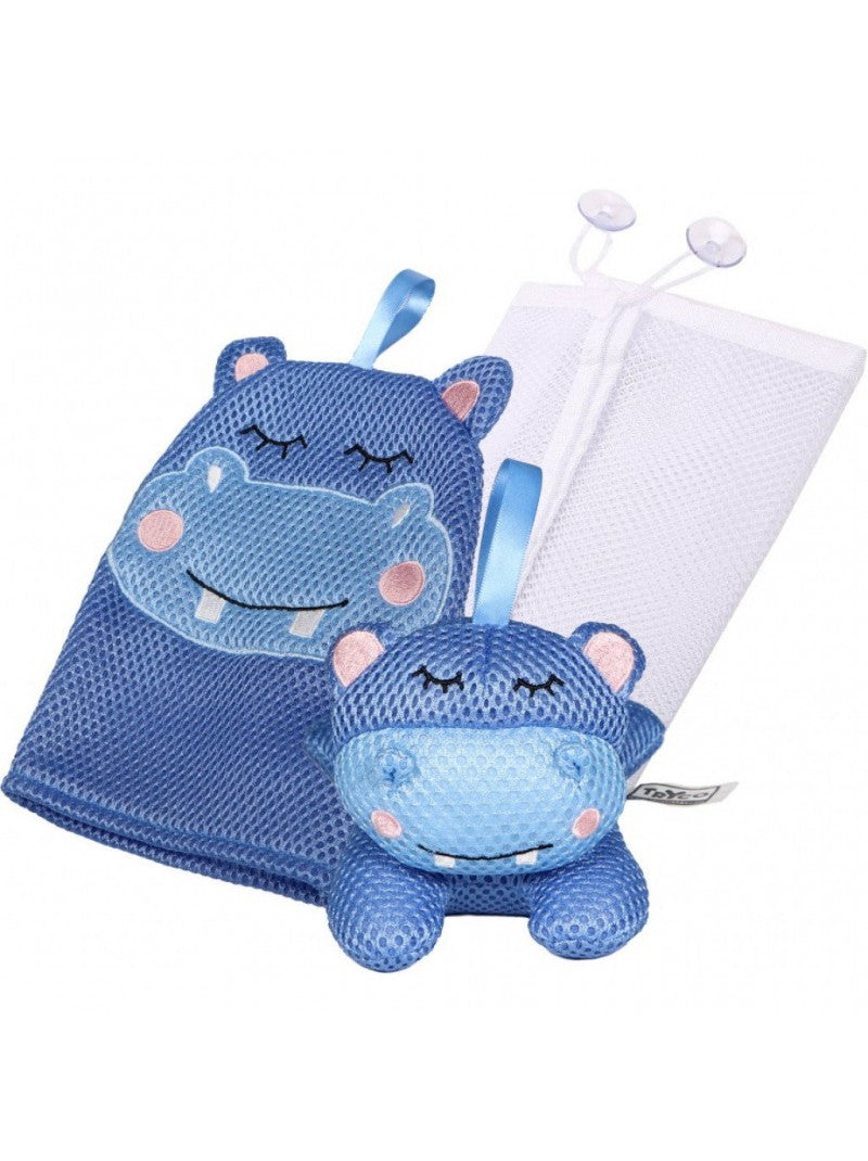 Badelegetøjet og badehandsken er lavet af netstof og takket være løkken kan du let hænge det op og posen kan fastgøres til badeværelsesfliserne med sugekopper.