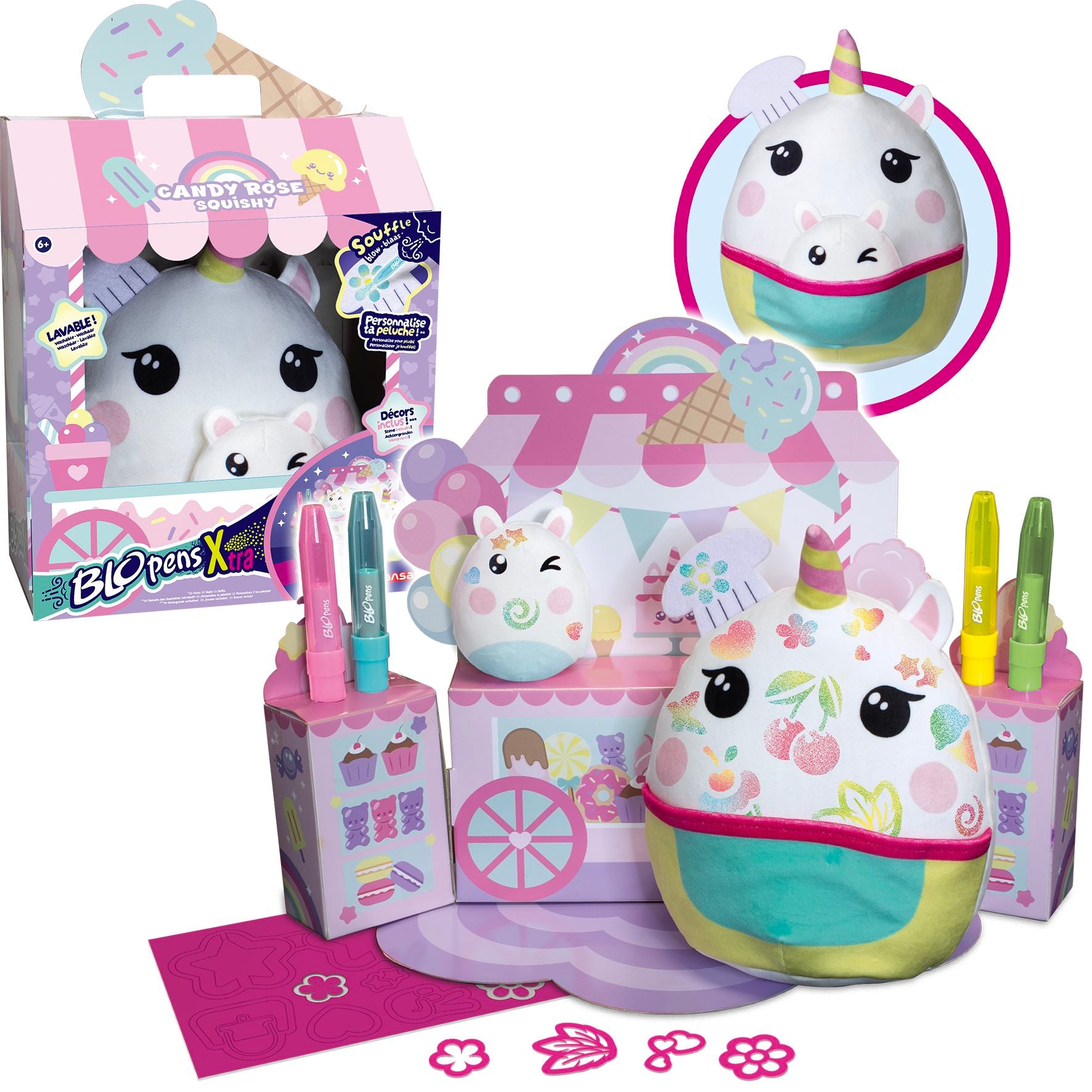 Med dette BLOpens Xtra Candy Rose Squishy-sæt kan børn først farvelægge deres egen squishy med de medfølgende sprøjtepensler (BLOpens) og bagefter klemme, lege og glæde sig over deres helt personlige søde design.