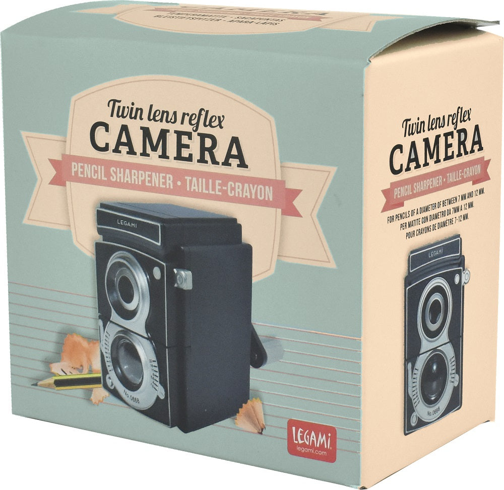 Blyantspidser i form af et kamera. Spidsningsgraden kan indstilles. Aftagelig bakke til resterne. Mål: 7x10x11,5 cm.