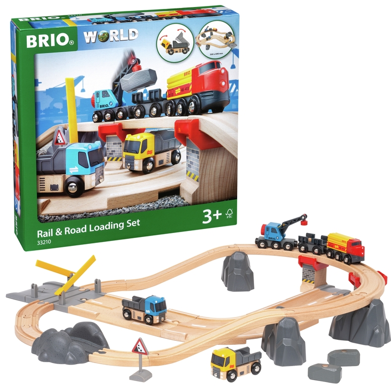 Fra togbane til vej. Inkluderer to lastbiler og et lokomotiv, der trækker en kranvogn, bropiller, overskæring, vejskilt, kran og skinner. Brug kranen til at læsse gods fra tog til lastbil med. Sæt med 32 dele. Fra 3 år.