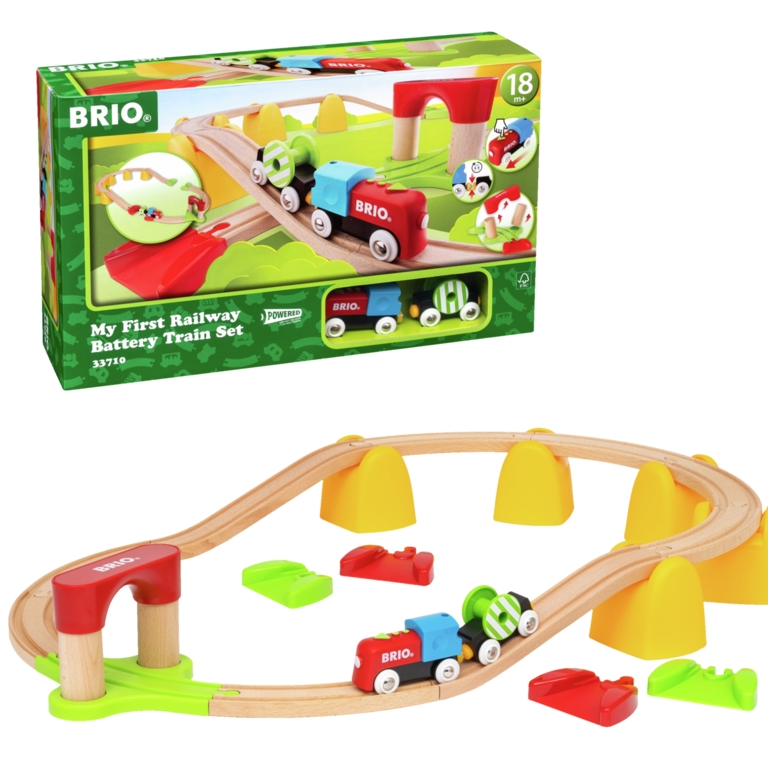 Wow! Så meget sjov på én gang for de yngste lokomotivførere. Start med at bygge en bane med bjerge og tunnellen, og kør op og ned og gennem tunnellen med toget. Tryk på knappen med pilen ovenpå toget, så begynder det at køre selv. Vognen med drejehjulet gør det ekstra sjovt at se toget køre forbi. Tog bruger 1 stk. AA batteri (ikke incl.). Sæt med 25 dele. Fra 18 måneder.
