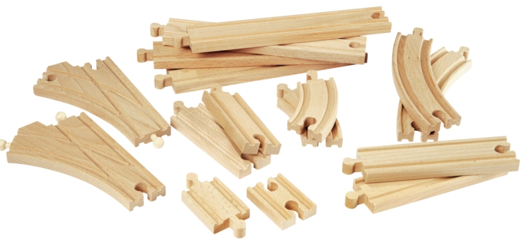 Til udvidelse af Brio basis togsæt. 16 udvalgte lige og buede skinner, skiftespor og forslag til 5 baner medfølger. Fra 3 år.