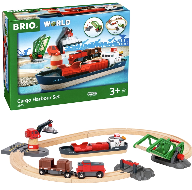 Brio togbane havnesæt. Containerskibet sejler tværs over havet og ankommer til havnen. Det batteridrevne lokomotiv er klar til at få læsset lasten over på vognen ved hjælp af den smarte havnekran. Når skibet sejler videre, skal du huske at løfte havnebroen. Sæt med 16 dele. Bruger 1 stk. AA batteri (ikke incl.). Fra 3 år.