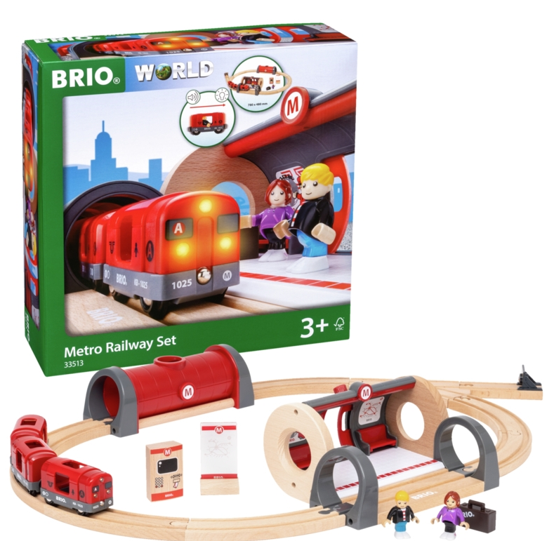 Tag metroen ind til byen! Jo hurtigere det skubbes, jo mere lys og lyd giver det fra sig. Med dette metrosæt genkender barnet den virkelige verden. Legeværdien øges med glidende døre, perron-sæder samt passagerer. Passer til alle BRIO tog. Lokomotivet bruger 21 stk. LR44 batterier (incl.). I alt 20 dele. Fra 3 år.