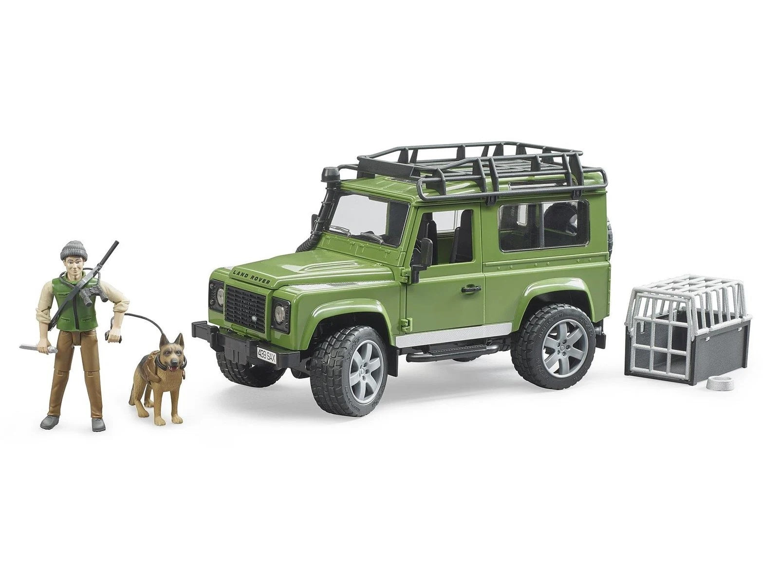 Da BRUDER-skovrangeren ofte arbejder i udfordrende terræn, skal han stole på et pålideligt køretøj. Land Rover Defender Station Wagon kombinerer fascinerende offroad-evne med holdbar design. Ligefrem som alle BRUDER-køretøjer blev denne model også baseret på originalen i stor detalje. Takket være sine overraskende detaljer, såsom den hævede strukturpanel på motorhjelmen og de talrige funktioner, vil ikke kun Land Rover-aficionados blive overbevist af den udviklede model. Ud over den åbne bagdør samt sidedøre åbner motorhjelmen for at vise den detaljerede motorblok. Bagsædet og trækstangskoblingen kan også fjernes. Affjedring på begge aksler betyder, at der ikke er nogen terrænbegrænsninger under leg. Forakslen kan også styres ved hjælp af det ekstra styrestativ, kendt fra BRUDER-traktorer (med i leveringsomfanget) for at give dig en mere naturlig spiloplevelse. Den matchende transportkennel er inkluderet i denne fantastiske sæt for at transportere hunden sikkert.