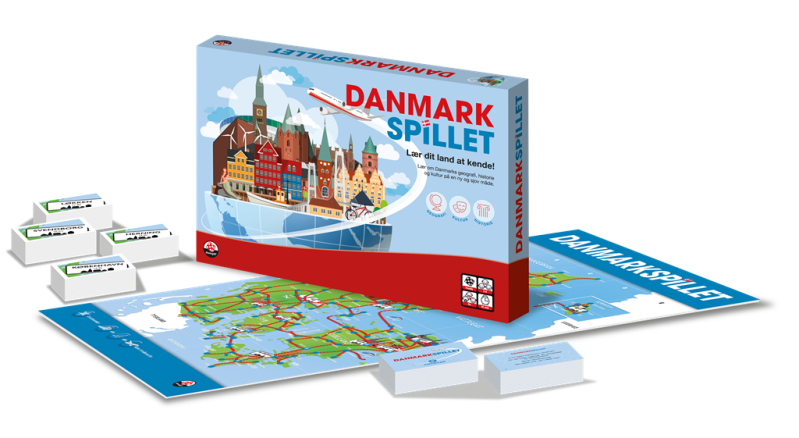Danmark Spillet er et sjovt og lærerigt familiespil med spørgsmål om Danmarks geografi, historie og kultur. Spillepladen er et Danmarkskort med store og mellemstore byer samt færge- og flyruter. Hver spiller får tildelt 16 byer, som han/hun skal besøge. Dvs. at spilleren skal lægge en fornuftig rejseplan, så han/hun hurtigst muligt når at runde alle de tildelte byer. Undervejs gælder det om både at have held med terningen og chancekortene, samt at have en god viden om Danmark for at kunne svare rigtigt på spørgsmålene. Den spiller, der først får besøgt alle sine byer og når hjem igen til byen, hvor han/hun startede, har vundet. Spilletid: Ca. 45 minutter. For 2-6 spillere. Fra 8 år.