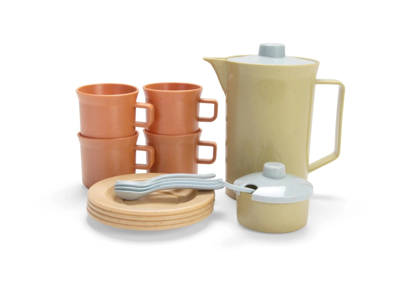Pragtfuldt kaffestel i dæmpede, naturlige farver til 4 kuverter. Sættet er ideelt til både indendørs og udendørs leg og det er nemt at rengøre i opvaskemaskinen.