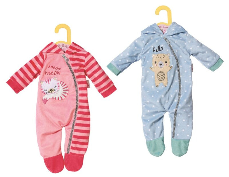 Med Dolly Moda behøver du ikke at vælge side, når det kommer til mode. De to sparkedragter er nemme at tage af og på. Bjørnen på den blå dragt med søde, hvide prikker opfordrer børn til at lave gymnastik. Den lille kat på sparkedragten med lyserøde striber, er klar til at putte. De sjove ører på hætten er en anden sød detalje. Takket være det afslappede fit kan BABY born, Baby Annabell og alle andre dukker i str. 39-46 cm bytte tøj ligeså tosset de vil.