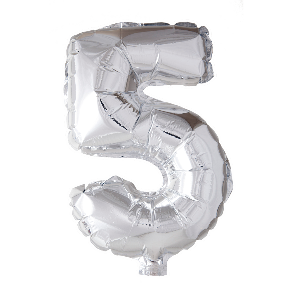 Folieballon formet som et 5 tal, måler 41 cm når det er pustet op med luft. Kan ikke bruge helium men kun luft, der følger sugerør med til at puste ballonen op.