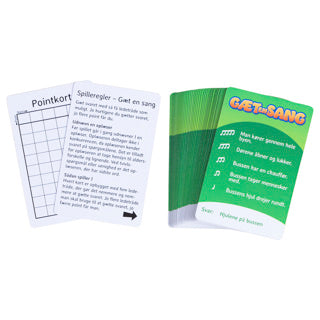 Test din sangviden, der er 50 sangtitler for hele familien Med Gæt en sang kan hele familien konkurrere på underholdende vis om hvem, der har den bedste sangviden og er bedst til at gætte ud fra så få ledetråde som muligt. Spillet består af en række kort, hvor hvert kort har fem ledetråde og et svar. For den enkelte deltager gælder det om at gætte det rigtige svar med så få ledetråde som muligt. Jo færre ledetråde man bruger, jo flere point får man. Den med flest point vinder spillet. NB: Kan bruges som udvidelse/erstatning til Gæt/Gæt 2 brætspillet. · Antal spillere: 3-8. · Spilletid: 15 min. · Anbefales til børn over 4 år.