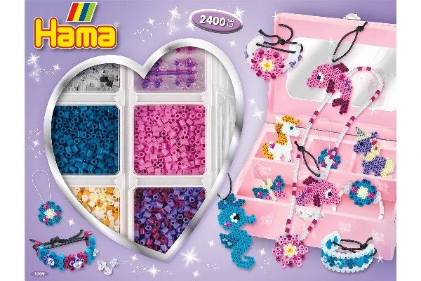 Æsken indeholder: Ca. 2.400 perler, 1 medium sekskantet stiftplade nr. 329, 4 Hama Gems, 1 vokset bomuldssnor, 1 elastiksnor, motivark, vejledning, strygepapir og 1 opbevaringsæske med låg.