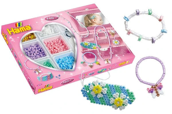 Ca. 2.400 perler, 1 medium sekskantet stiftplade nr. 329, 1 Hama Gems, 1 Hama connector, 2 elastiksnore, motivark, vejledning, strygepapir og 1 opbevaringsæske med låg.