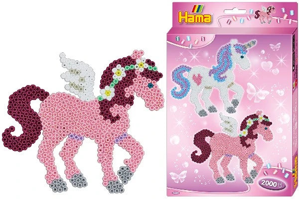 Æsken indeholder: Ca. 2.000 midi perler ass. farver, 1stk. enhjørning stiftplade nr. 315, motivark, vejledning og strygepapir.