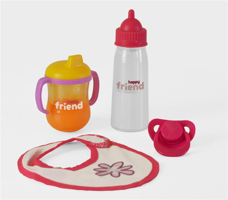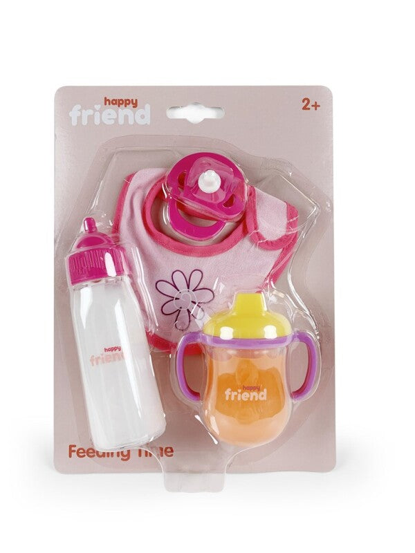 Spisetid! Din dukke vil altid være glad med dette flotte måltidssæt! Sutteflaske, juicekop, hagesmæk og sut sørger for, at dukken har alt, der skal til for at blive mæt og tilfreds. Indeholder 4 dele: Mælke-sutteflaske, juicekop, hagesmæk og sut. Fra 2 år.