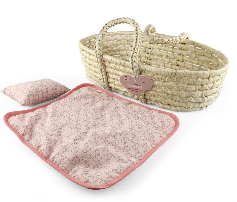 Tid til en lur! Læg dukken i kurven på den bløde pude og tæppet, så hun kan få et hvil, inden det igen er legetid. Moses fletkurven med håndtag rummer dukker op til 46 cm og opfordrer til fantasifuld leg og rollespil. Fra 3 år.