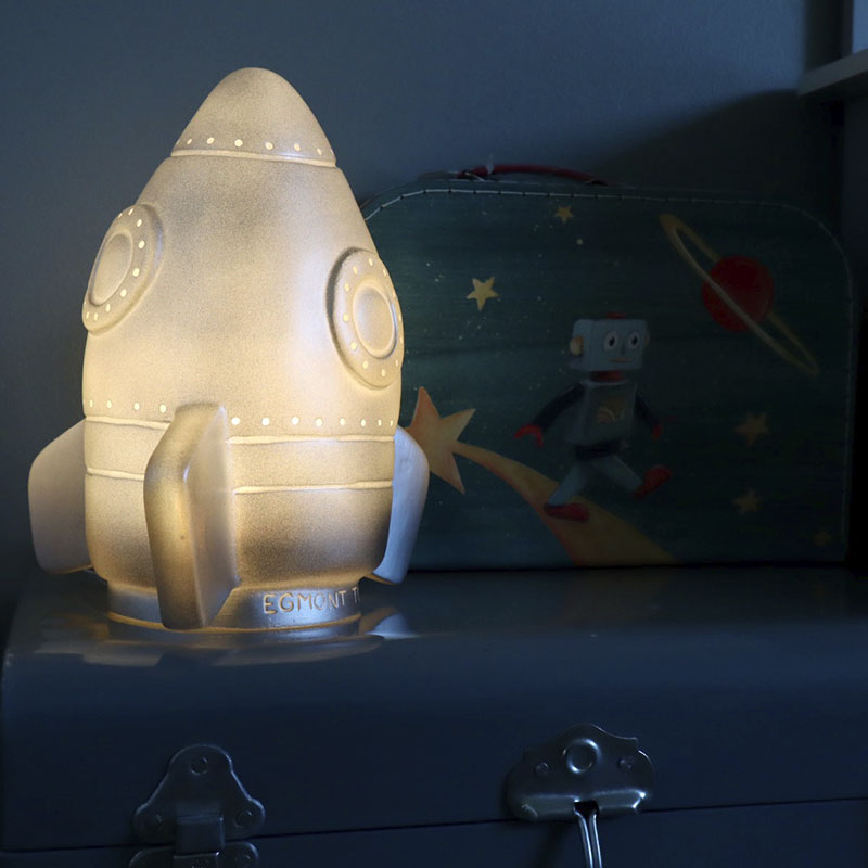 3 … 2 … 1 Den sølv rumraket er klar til afgang! En natlampe hjælper trygt børnene med at falde i søvn om aftenen og skaber tryghed hvis de vågner om natten.
