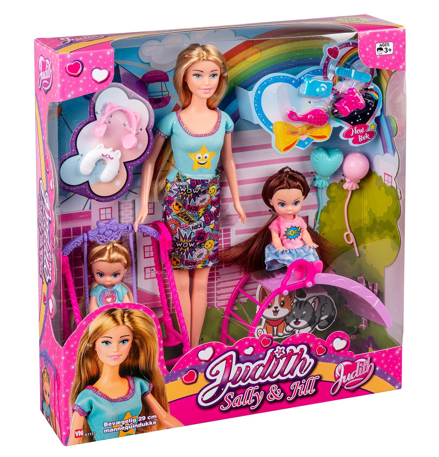 Judith med Sally og Jill på legepladsen. Sæt med 3 dukker, gynge, rutsjebane og tilbehør.