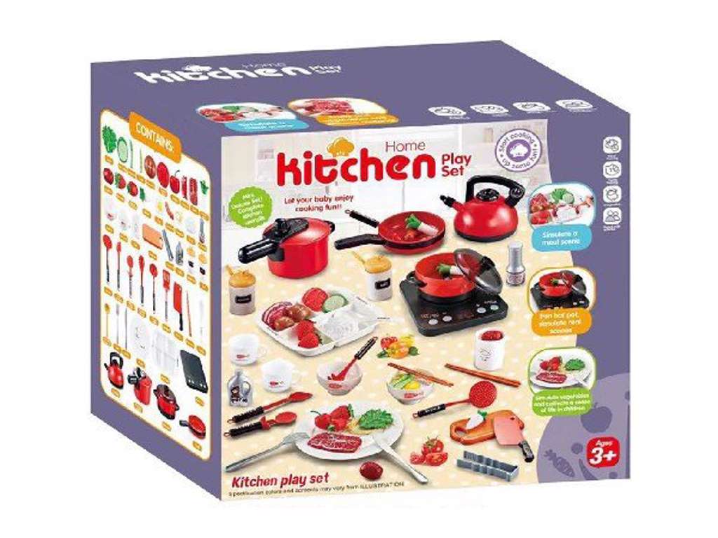 Indeholder gryder, pander og andet udstyr til at lege med. Så man kan tilberede og servere mad.