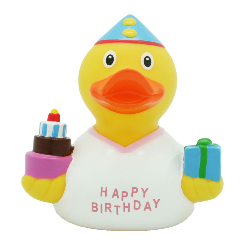 Badeand som ønsker dig Happy Birthday i hvid trøje. Badeænderne har målene ca 8,5x7,5x8,5 cm.