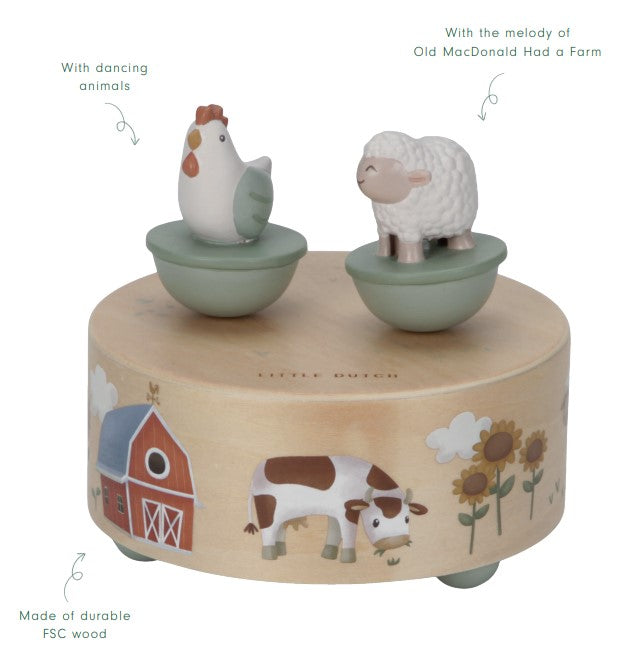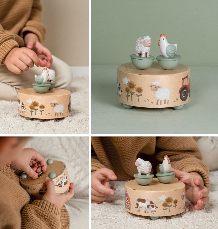Se kyllingen og fåret snurre rundt, mens musikken spiller! Denne runde spilledåse er dekoreret med en munter scene fra den elskede Little Farm. Træk forsigtigt i bunden og sæt den magiske dans i gang. Når melodien begynder at spille, danser fårene og kyllingerne yndefuldt til de velkendte toner af "Old MacDonald had a Farm" . En vidunderlig gave, der vil bringe smilet frem på dit barns ansigt, så snart den musikalske lille gård begynder begynder at spille.