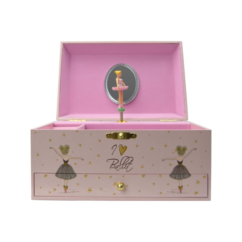 Åbn op for en eventyrlig verden! Dette flotte smykkeskrin har en ballerina indeni, som vil danse til en lille dejlig melodi, når du åbner låget. Skrinet er beklædt med fløjlsblødt stof indeni og har spejl, et stort rum, et mindre rum til små ting, og nederst en skuffe, så her er god opbevaringsplads til alle dine halskæder, armringe, øreringe og andre skatte. Skrinet er lavet af træ og skaber ikke bare orden på dit værelse, men vil også pynte. Trækkes op bagpå. Fra 3 år.