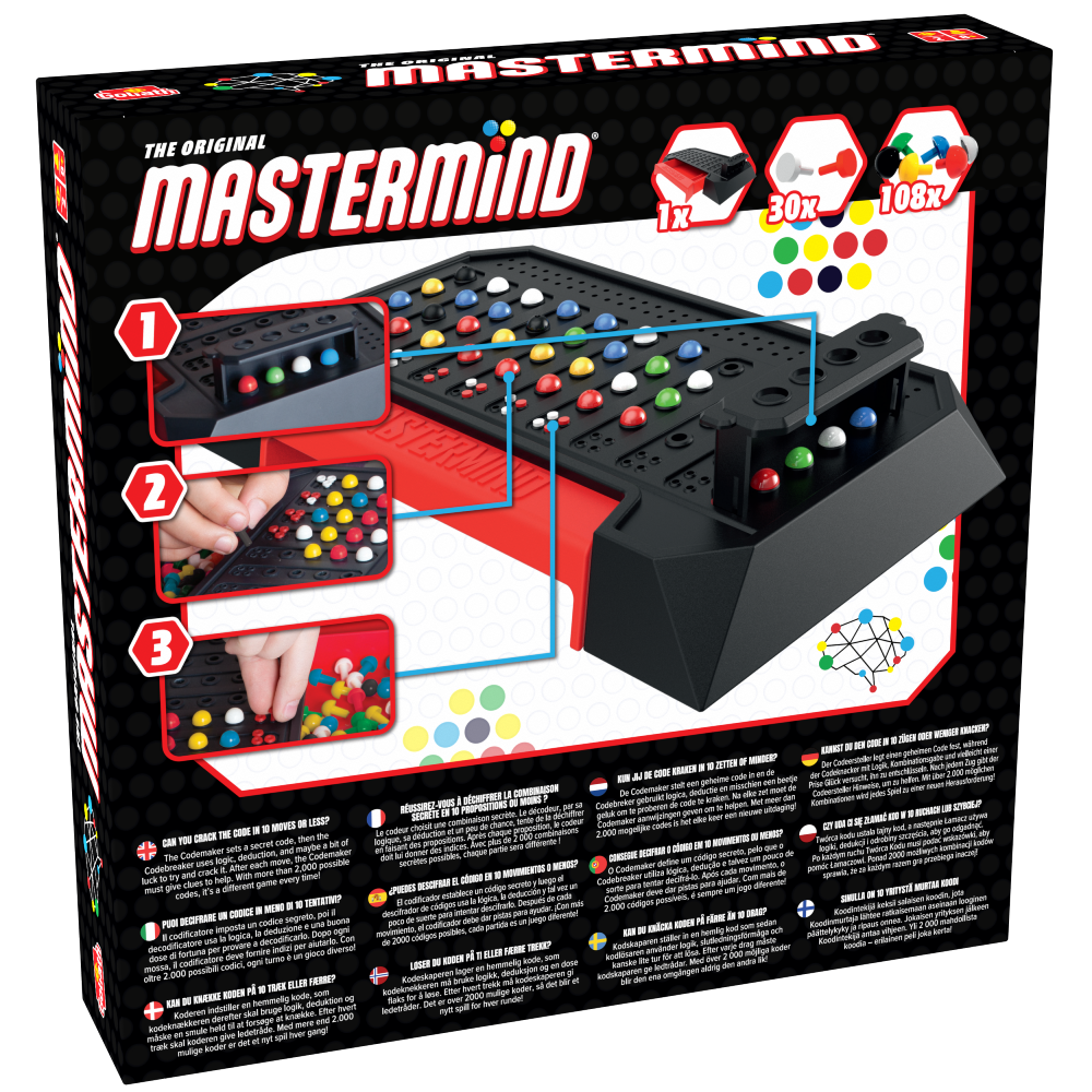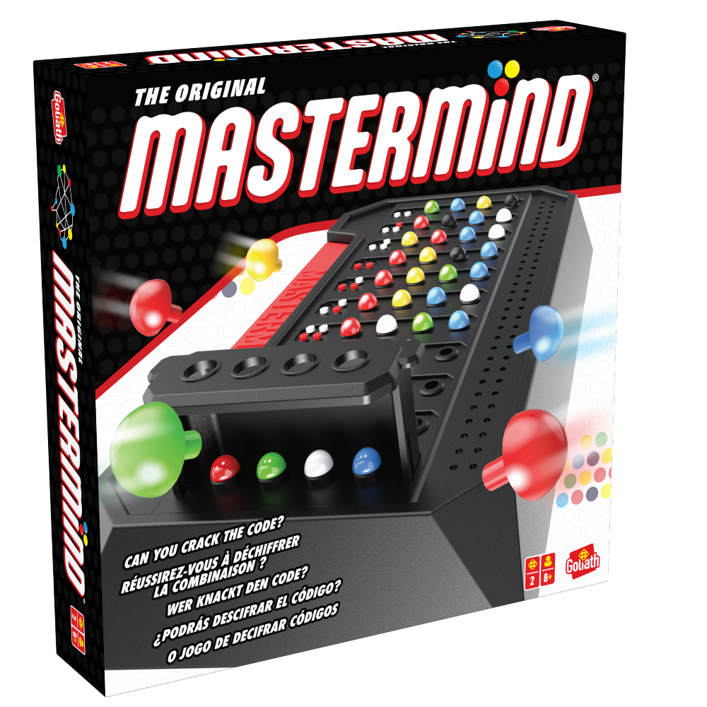 Test dine evner til at knække kode med Mastermind, det udfordrende spil om logik og deduktion. Kan du knække koden på 10 træk eller mindre? Kan du lave en kode, der ikke kan knækkes? Med mere end 55 millioner solgte enheder er Mastermind et fantastisk strategispil og et af verdens mest populære spil nogensinde. Det er nemt at lære og hurtigt at spille, og med mere end 2.000 mulige koder er det forskelligt hver gang. Kodemageren sætter en hemmelig kode, og derefter forsøger kodebryderen at matche koden ved hjælp af logik, deduktion og måske endda lidt held. Efter hvert træk giver kodemageren ledetråde til kodebryderen. Gør koden endnu mere snu ved at bruge flere pinde i samme farve eller ved at lade et eller flere pindhuller være tomme. Med så mange mulige kodekombinationer er hvert spil garanteret en hjernetrim. For 2 spillere, fra 8 år og opefter. Indeholder spillekonsol med indbygget opbevaringsbakke og kodestiftskjold, 108 kodestifter i 6 farver, 30 nøglestifter i to farver og komplet instruktioner.