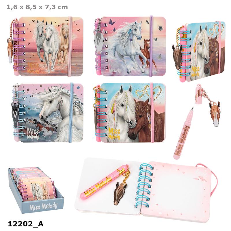 Mini notesbog sæt med lille kuglepen med et sødt hestehoved som vedhæng. Fås i fire forskellige fine Miss Melody hestemotiver.