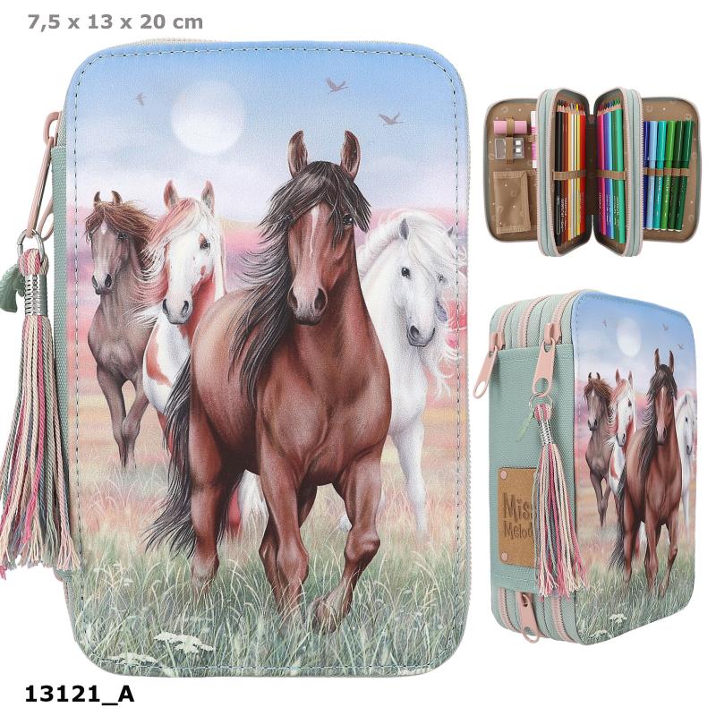 Flot penalhus i afdæpet grøn og ros har motiv af fire smukke heste i galop på en græseng fra Miss Melody HOOF CLATTER serien. Penalhuset har en flot kvast med hesteperle som lynlåsvedhæng og indeholder tre store rum, der er fyldt med alt, hvad man skal bruge til at tegne og skrive med både i skolen og derhjemme: saks, lim, lineal, viskelæder, blyantspidser, blyanter, 18 farveblyanter samt 18 farvetuscher.