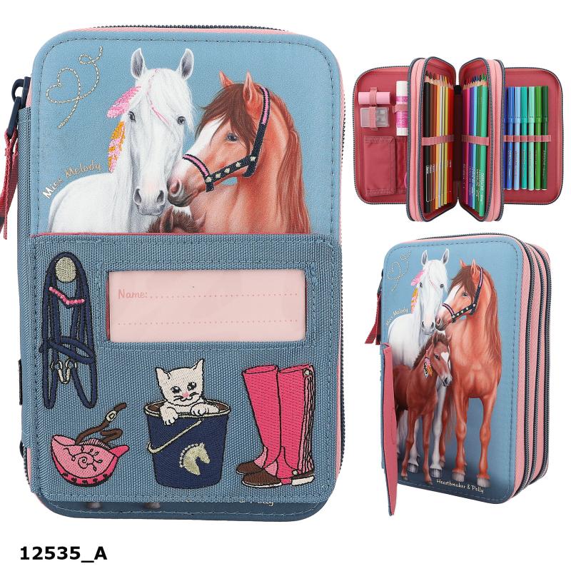 Et supersødt penalhus fra Miss Melody MY LITTLE FARM serien. Penalhuset har fine broderidetaljer og en magnetisk stalddør, der kan åbnes. Bag den gemmer sig hestene Miss Melody, Pelly og føllet Heartbreaker. Penalhuset indeholder tre store rum, der er fyldt med alt, hvad man skal bruge til at tegne og skrive med både i skolen og derhjemme, som bla. saks, lim, lineal, viskelæder, blyantspidser, blyanter, 18 farveblyanter og farvetuscher samt meget mere.