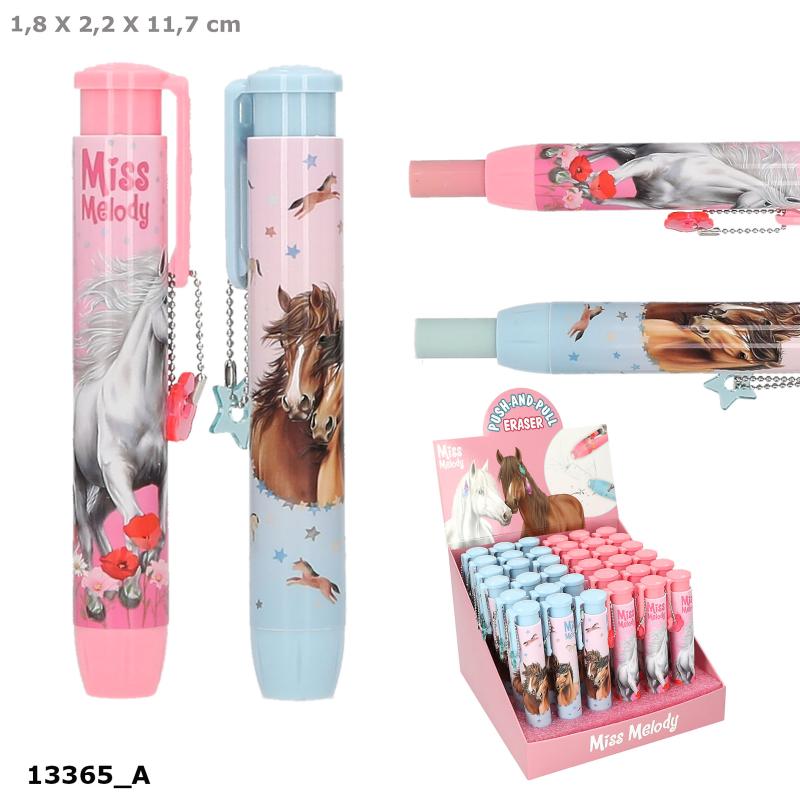Smart viskepen med mekanisk skub-ud funktion og i fint Miss Melody design. Viskelæderet er i praktisk kuglepensform, hvor viskelæderet kan skubbes længere frem ved et enkelt klik på toppen af pennen. Fås i to forskellige farvevarianter: lyseblå med stjernevedhæng og lyserød med blomstervedhæng.