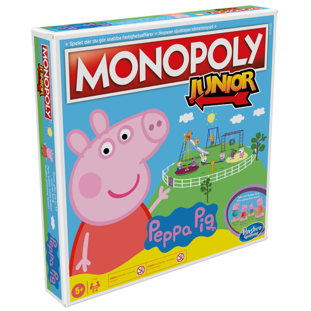 PEPPA PIG TEMA: Lær at tjene sammen med Peppa og hendes familie! I dette Monopoly Junior-brætspil kan børn forestille sig at være en del af Peppa Pigs glade og sjove verden.