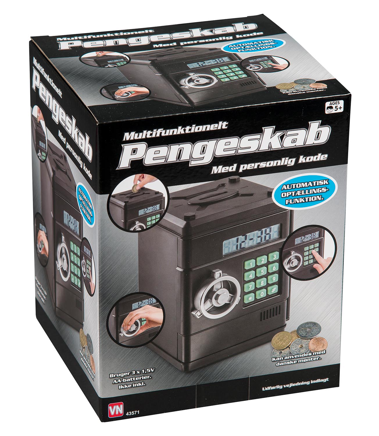 Multifunktionelt pengeskab. Med automatisk optælling af danske mønter, tjek/justering af opsparing, personlig kode, tid/dato og alarm. Inkl. udførlig vejledning. Ekskl. 3 stk. AA-batterier.