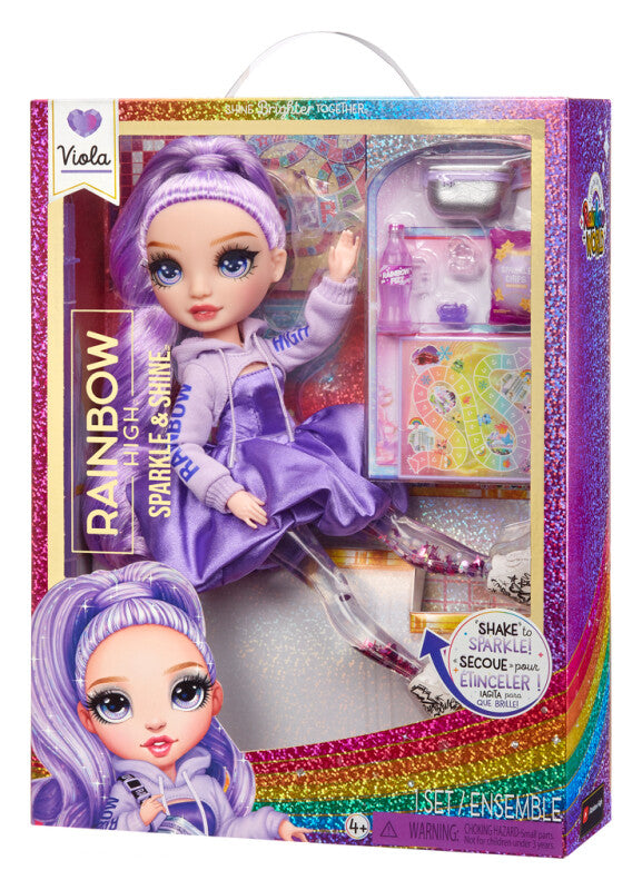 Fordi Rainbow High ejer alle regnbuer, kommer her Sparkle & Shine - en anden slags regnbue, som kun kommer til syne om natten. Sparkle & Shine dukkerne er ægte, sjældne og unikke ligesom de klassiske Rainbow High fashiondukker. Dukkerne er smukke på hver deres måde og har deres helt egen personlige stil. Men det, der adskiller dem fra alle andre dukker, er, at deres ben er fulde af væske med fascinerende glimmer. Du kan ryste dukkerne, som du ryster en snekugle. Deres helt unikke egenskab vil give inspiration til mange sjove historier. Dukkerne er klædt i unikke outfits, der udtrykker deres individuelle personlighed og karakteristiske farve. Fås i 4 varianter. Fra 4 år. Inkluderer: - Rainbow High Sparkle & Shine fashiondukke med ben fyldt med glimmer - unikt outfit - sjovt legetilbehør: sko, solbriller, hovedtelefoner m.m.
