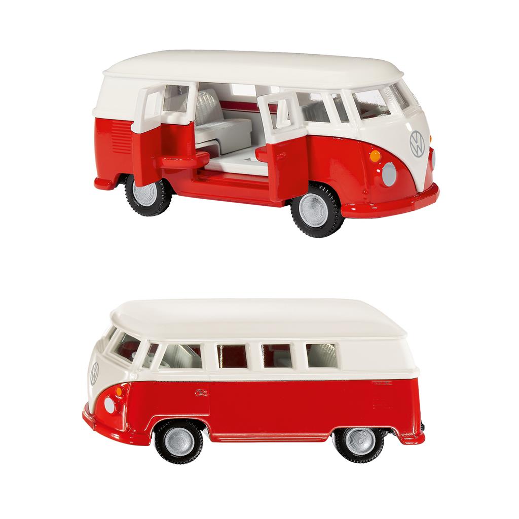 Volkswagens T1 er mere end et køretøj - det er en legende! Succeshistorien om den tyske minibus, kærligt kaldt Bulli af fans, startede tilbage i 1950'erne. Det var symbolet på økonomisk vækst under genopbygningen i Tyskland, i USA var det en kultmodel for hippiegenerationen. Den runde model med blank lak og krom kofangere appellerer stadig til mange fans på grund af dens vintage karakter. Som Siku-model fås VW T1 naturligvis i den umiskendelige hvid-røde farvekombination med originale hjul.