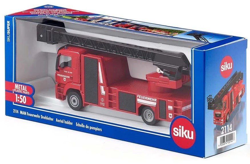 siku 1:50 Man Lastbil med Stige er en detaljeret legetøjsmodel af en MAN-brandbil med. Modellen har en lang række funktioner: Sammenklappelig kurv, udtrækkelig og fuldt roterende stige og fremragende mobilitet takket være gummidæk. Perfekt tilføjelse til andre siku-produkter. Materiale: Metal/plast, Målestok: 1:50, Mål: 19,7 x 5,8 x 34,2 cm. Fra 3 år.