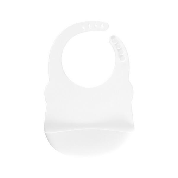 Denne silikone hagesmæk hvid med lomme, er blød og behagelig at have på, der er 4 justeringshuller og en lomme til at fange noget af det mad barnet spilder. Nem at rengøre.