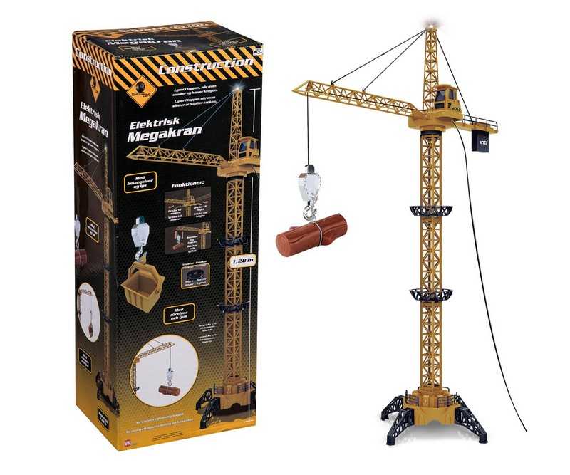Mega kran. 1,28 meter høj kabelstyret kran. Kan dreje både til højre og venstre og hæve/sænke krogen. Lyser i toppen når krogen hæves og sænkes. Ekskl. 4 stk. AA-batterier.