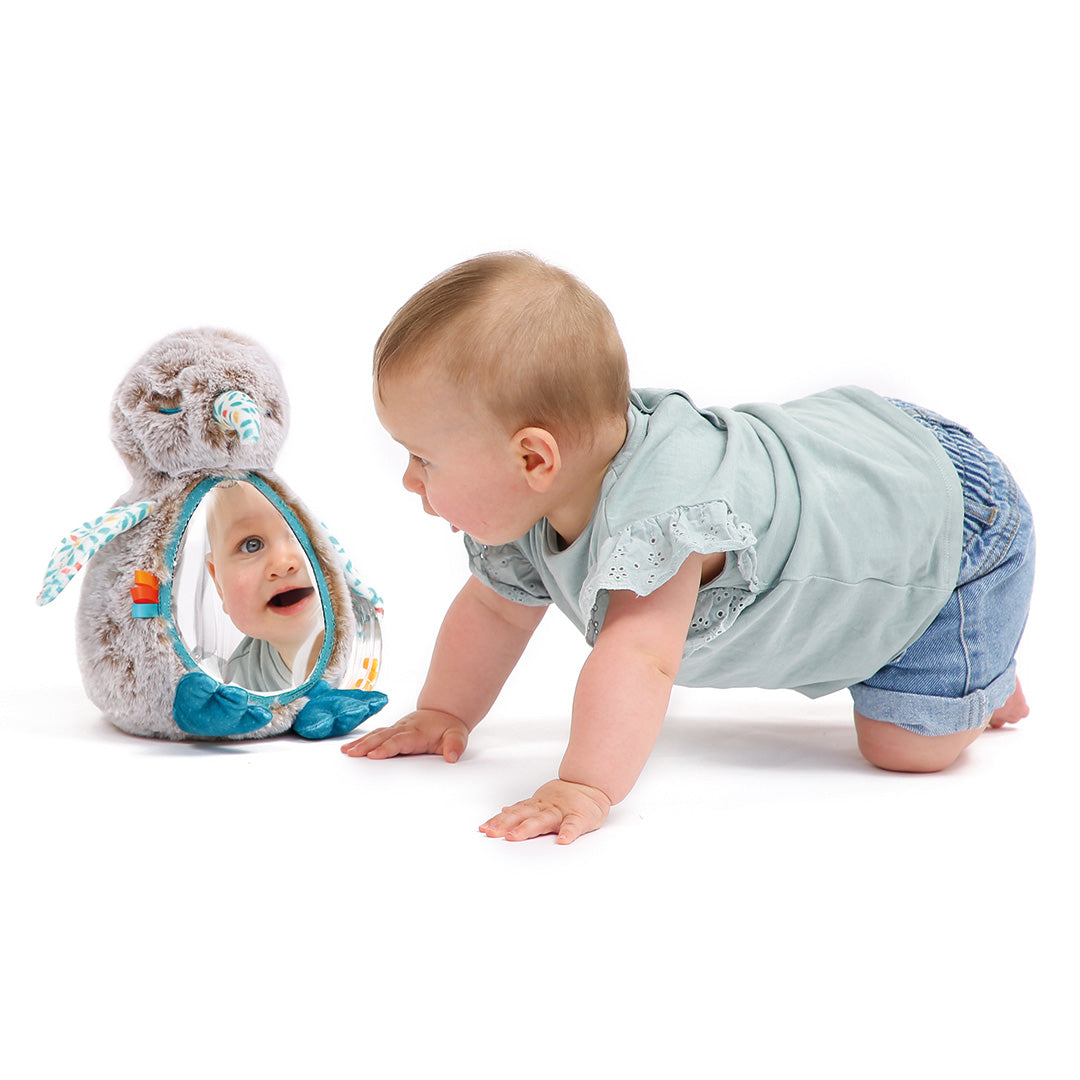 En baby undersøger verdenen og hvad er sjovere end at møde en blød kiwifugl se en sød baby i spejlet.