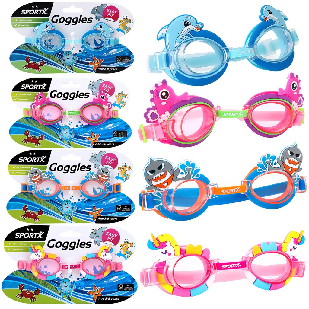 SportX Kids svømmebriller i en sjov dyreform: delfin, enhjørning, haj og søhest. Kvalitet to stjerner. Med justerbar næsebro, justerbar silikone pandebånd, sikkerhedslinser og UV-beskyttelse. Leveres i 4 assorterede størrelser på kortet. Velegnet til børn fra 3 til 8 år.