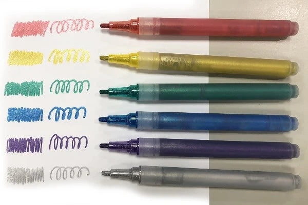 Tusch med glimmer til at tegne på sten med, indeholder farverne blå, sølv, guld, rød, lilla og grøn.
