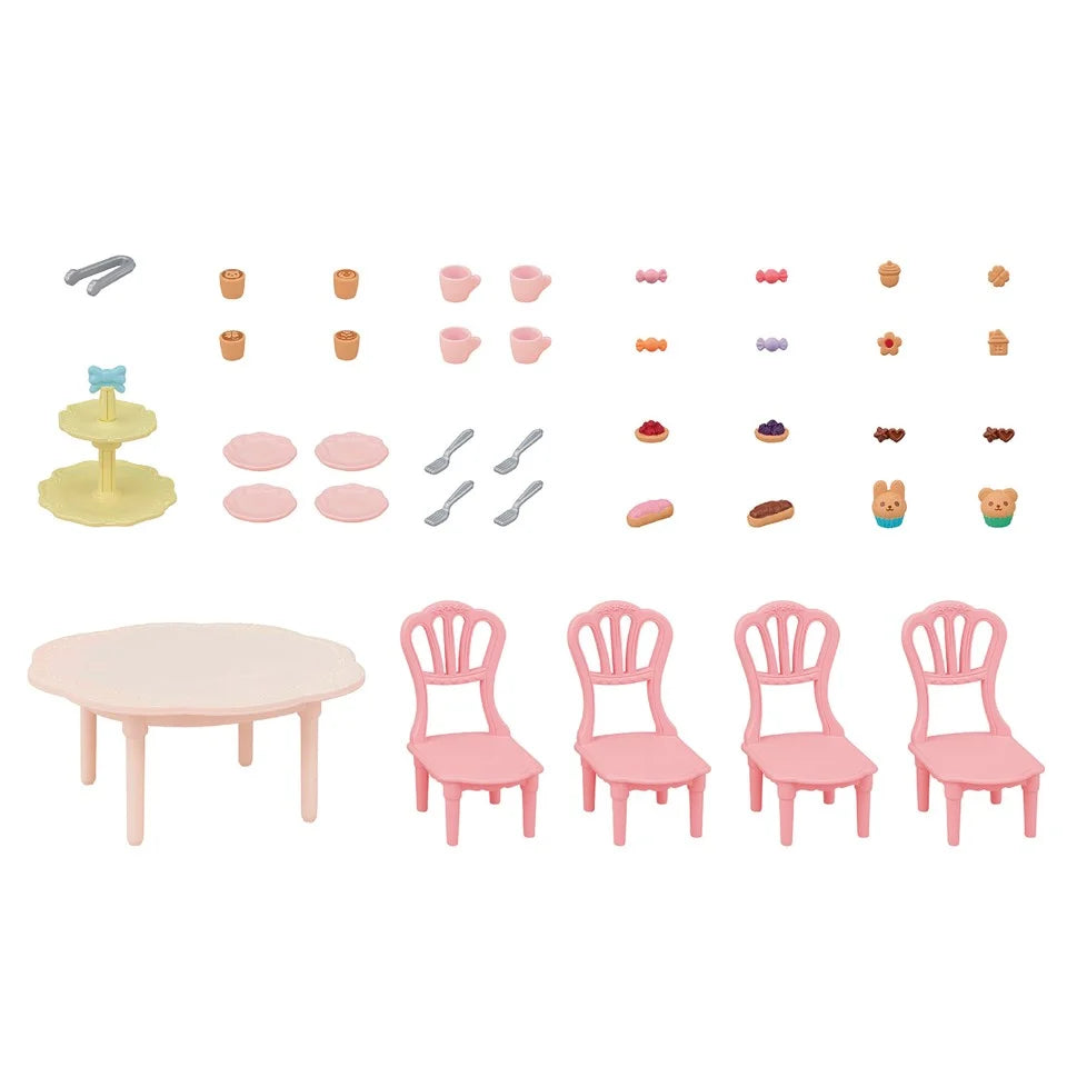 Dette festsæt indeholder alt tilbehør til at underholde dine venner! Den har et farverigt bord og stole, kaffe, kager og mange søde sager, i alt 30 te-tilbehør. Det omfatter et udvalg af søde sager som cupcakes, tærter og småkager og fire forskellige slags latte art (kløver, tulipan, pingvin, kat). Kombiner med andre Sylvanian møbler, huse og figurer. Velegnet til alderen 3+.