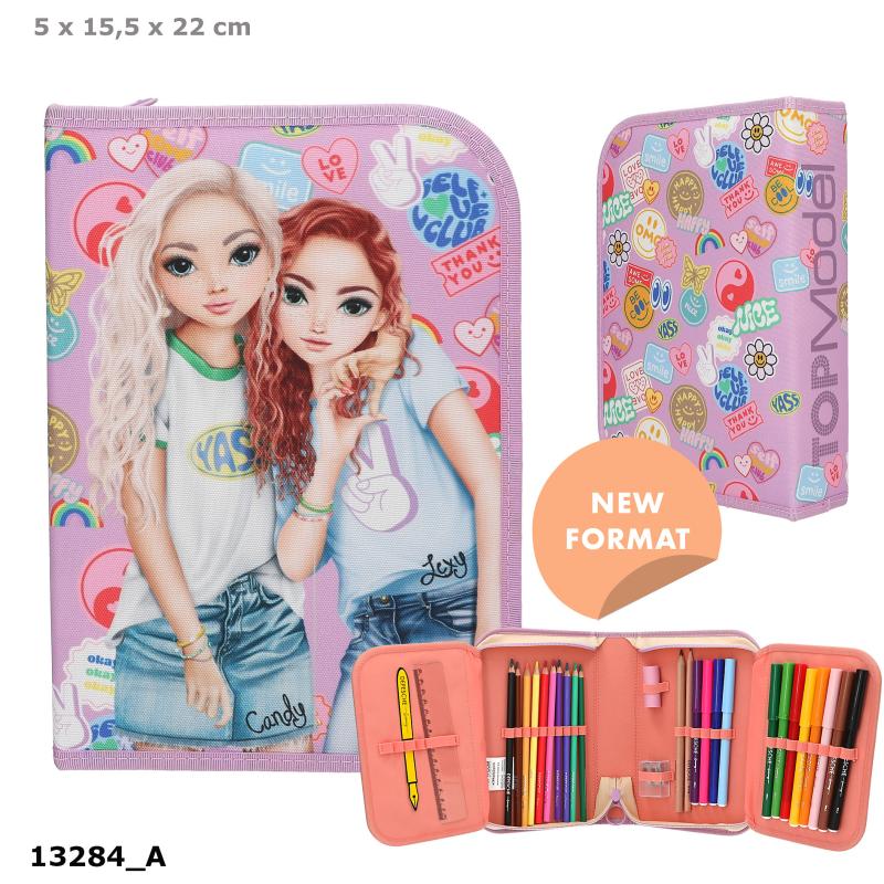 Superfint og praktisk penalhus fra TOPModel serien GIRL POWER i lyslilla med farverigt all-over-print af diverse ikoner og patches samt motiv af TOPModellerne Lexy og Candy på forsiden. Penalhuset har lynlåslukning og opdelt i to separate fag med to yderligere udfoldelige fag og er fyldt med 12 tusher, 10 farveblyanter, 2 blyanter, 1 blyantspidser, 1 viskelæder, 1 alm. lineal og 1 trekantlineal. Penalhuset har desuden et lille spejl med en lomme under. Tip: Personliggør dit penalhus ved at tilføje et vedhæng i den farvede lynlås. Mål: 5 x 15,5 x 22 cm