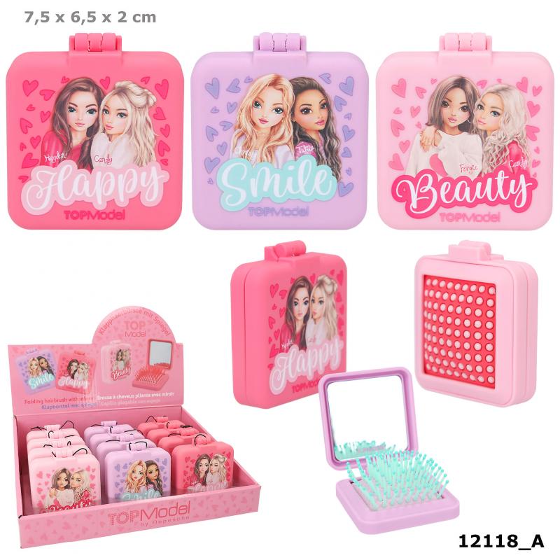 De foldbare hårbørster fra TOPModel i en cool firkantet form har en gummieret overflade, der giver et behageligt blødt touch. Med flotte modelmotiver og trendy tekster på ydersiden og farvede pigge og spejl på indersiden. Fås i tre farver: rosé, lilla og pink.