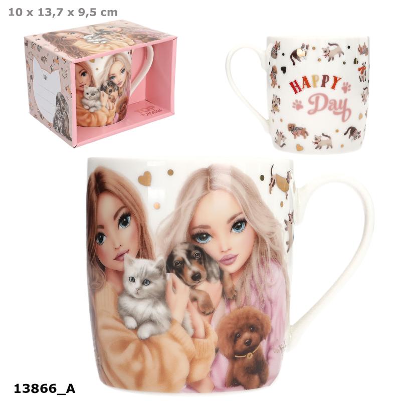Porcelænskruset fra TOPModel FUR EVER FRIENDS serien har et stort motiv af TOPModellerne Hayden og Candy med to søde hunde og katte i armene samt teksten "Happy day" printet med guldskrift omgivet af et sødt hunde- og kattemotivprint. Kruset kommer i en elegant gaveæske med plads til at skrive en personlig hilsen. Kruset tåler ikke opvaskemaskine eller mikroovn på grund af printet. Kapacitet 300 ml. Materiale: New Bone China