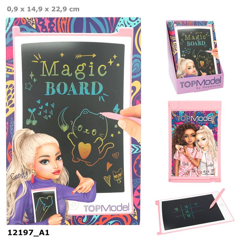 Mal og skriv igen og igen: TOPModels magiske tavle lader dig lade kreativiteten flyde frit. Hvis du tegner med den medfølgende pen, vises farverne gul, orange, grøn og blå på displayet. Med en knap til at viske ud og en knap til at gemme kunstværket. Displayet i det lyserøde etui med cool TOPModel-motiv på bagsiden måler 8,5 tommer. Knapbatteri medfølger og kan udskiftes.